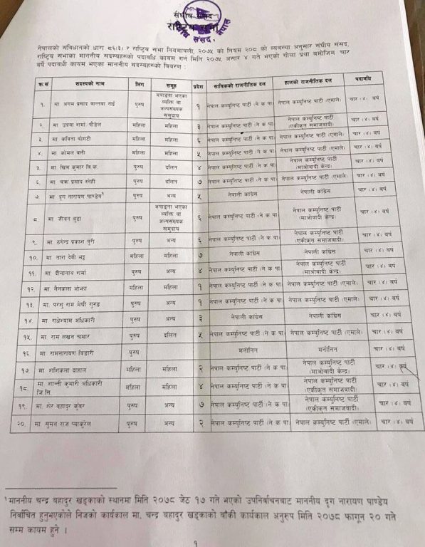 रिक्त पदका लागि निर्वाचित भइसकेका सन्दर्भमा चार वर्षे पदावधि भएका २० राष्ट्रियसभा सदस्यको पद आजबाट सकिन लागेको हो ।