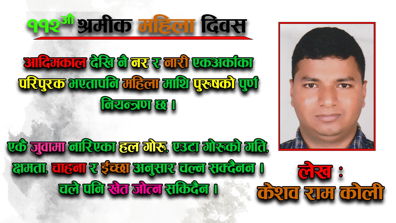 आज फागुन २४ गते, तदानुसार मार्च, ८ तारिख ११२ औँ अन्तर्राष्ट्रिय नारी दिवस । प्रत्येक वर्ष मार्च ८ तारिखका दिन विश्वभरि मनाइने नारी दिवस । यो वर्ष “Gender equality today for a sustainable tomorrow” भन्ने मुख्य नाराका साथ अन्तर्राष्ट्रिय नारी दिवस विभिन्न कार्यक्रमका बीच मनाइने छ । नेपालमा ११२ औँ अन्तर्राष्ट्रिय नारी दिवस २०७८ “सामाजिक न्याय र लैङ्गिक समानताः दिगो विकासको सुनिश्चितता” भन्ने राष्ट्रिय नाराका साथ महिला केन्द्रीत विभिन्न कार्यक्रमहरु स्थानीय तहदेखि राष्ट्रिय स्तरसम्म महिला अधिकारकर्मी, संघ–सँस्था, राजनीतिक दलका भातृसंगठन, महिला आयोग, महिला बालबालिका तथा जेष्ठ नागरिक मन्त्रालय लगायतको आयोजनमा सम्माननीय राष्ट्रपति देखि सम्माननीय प्रधानमन्त्री सम्मले सम्बोधन गर्ने, शुभकामना दिने कार्यक्रमहरु तय गरिने छन ।