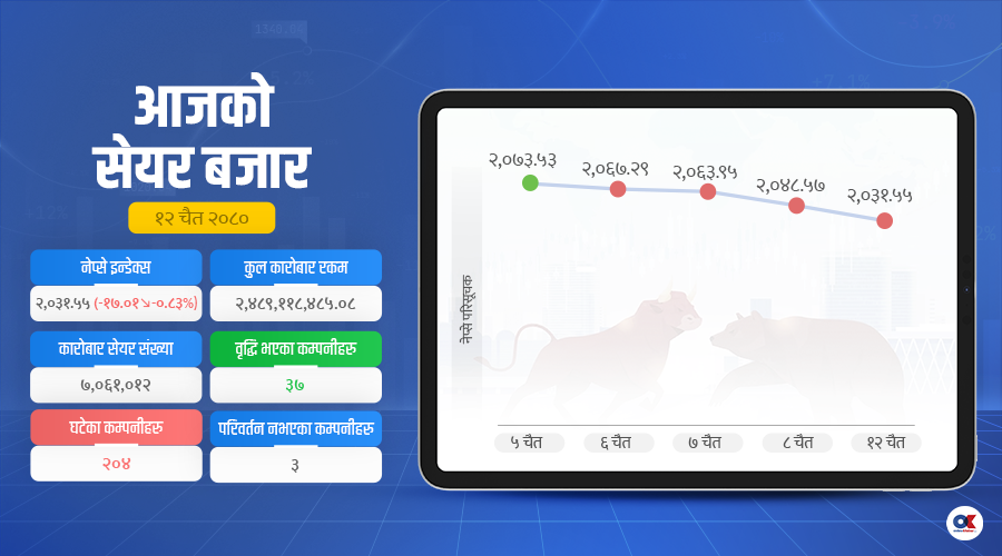१२ चैत, काठमाडौं । होली पर्वपछि खुलेको सेयर बजार १७ अंक घटेको छ । सो अंकको कमीपछि नेप्से २०३१ अंकमा कायम भएको छ । दिनभर कुल २ अर्ब ४८ करोड रुपैयाँको कारोबार भएको छ । ३७ कम्पनीको मूल्य बढ्दा २०४ को घटेको छ भने ३ को स्थिर रह्यो ।